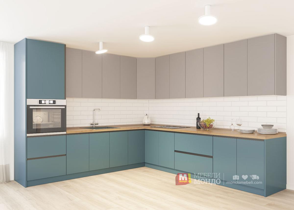 Модулна кухня Софи е съчетание от изчистен модерен дизайн и практична функционалност, създадена за хора, които ценят хармонията у дома. Елегантните горни шкафове в мек сив тон балансират с долните модули в наситено тюркоазено синьо, придавайки на пространството стил и дълбочина. Плотът в дървесен цвят внася топлина и уют, а гланцираните повърхности и изчистените линии подчертават съвременната визия.