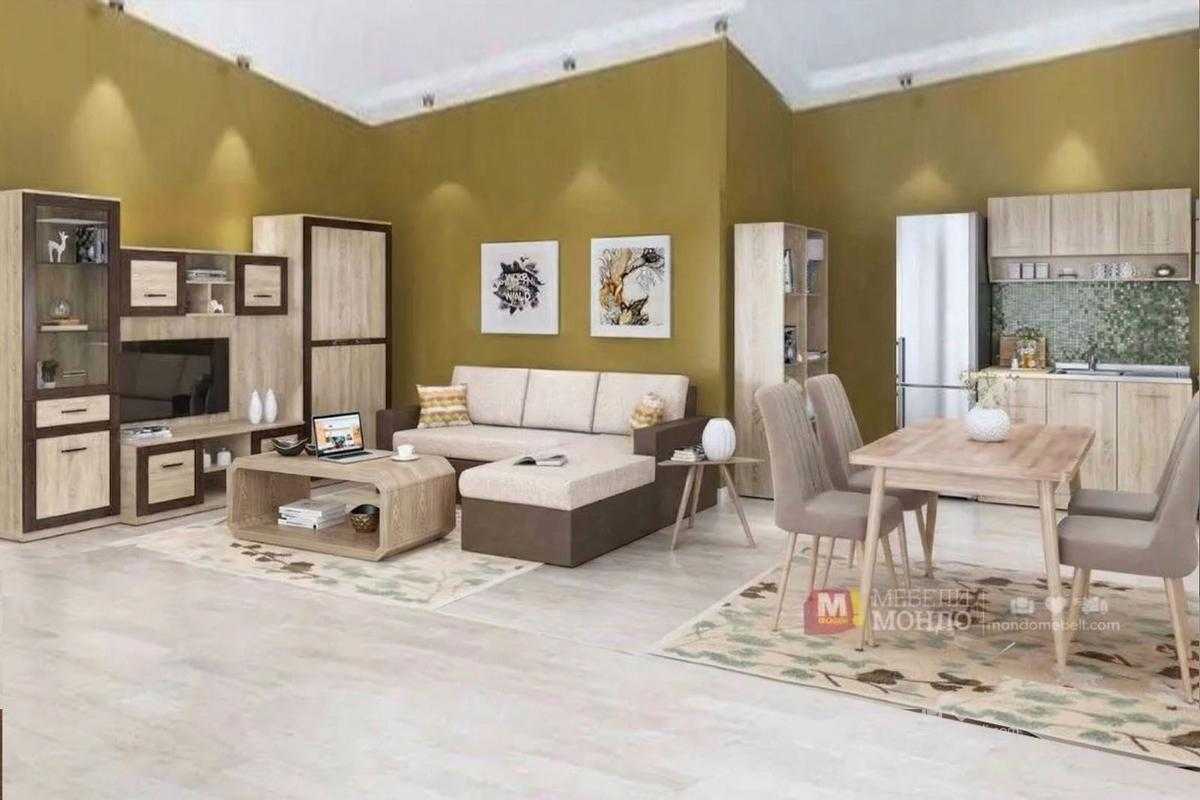 Комплект мебели за обзавеждане на дневна стая в топли цветове на бежаво и кафяво. Качествени мебели на достъпни цени. Вече можете лесно и бързо да обзаведете целият дом с идеи и мебели от Мондо.