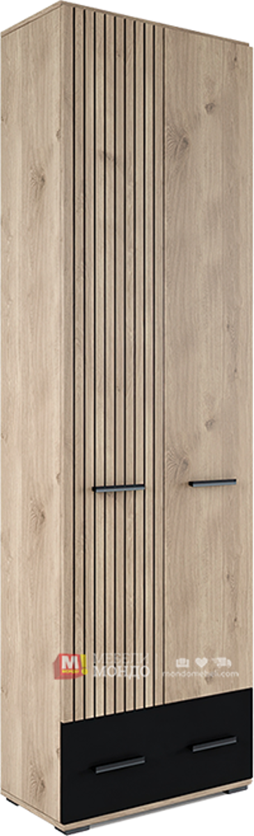 Този гардероб не е просто място за съхранение, а интериорен акцент. Комбинацията от дъб и черно е вечна класика, която лесно се комбинира с други мебели. Тесните му размери го правят подходящ дори за по-малки помещения, без да прави компромис с капацитета.
