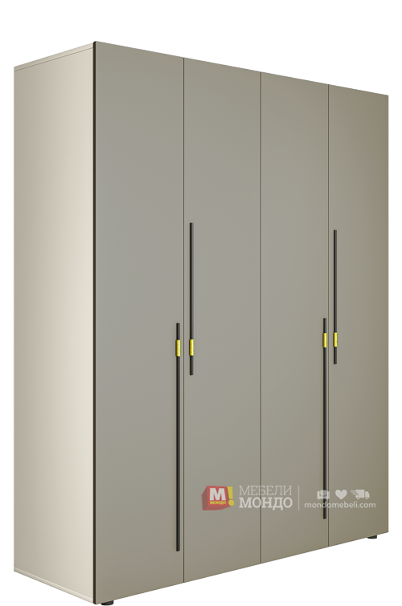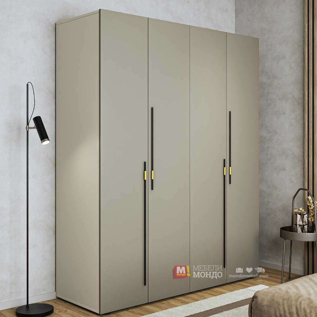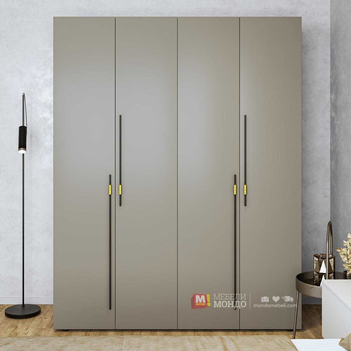 Плътните врати в стилен неутрален цвят създават усещане за подреденост и спокойствие, а дългите вертикални метални дръжки добавят фин дизайнерски акцент и удобство при ежедневна употреба. Гардеробът е проектиран така, че да използва оптимално височината на помещението и да осигури достатъчно място за съхранение на дрехи, спално бельо и аксесоари.
