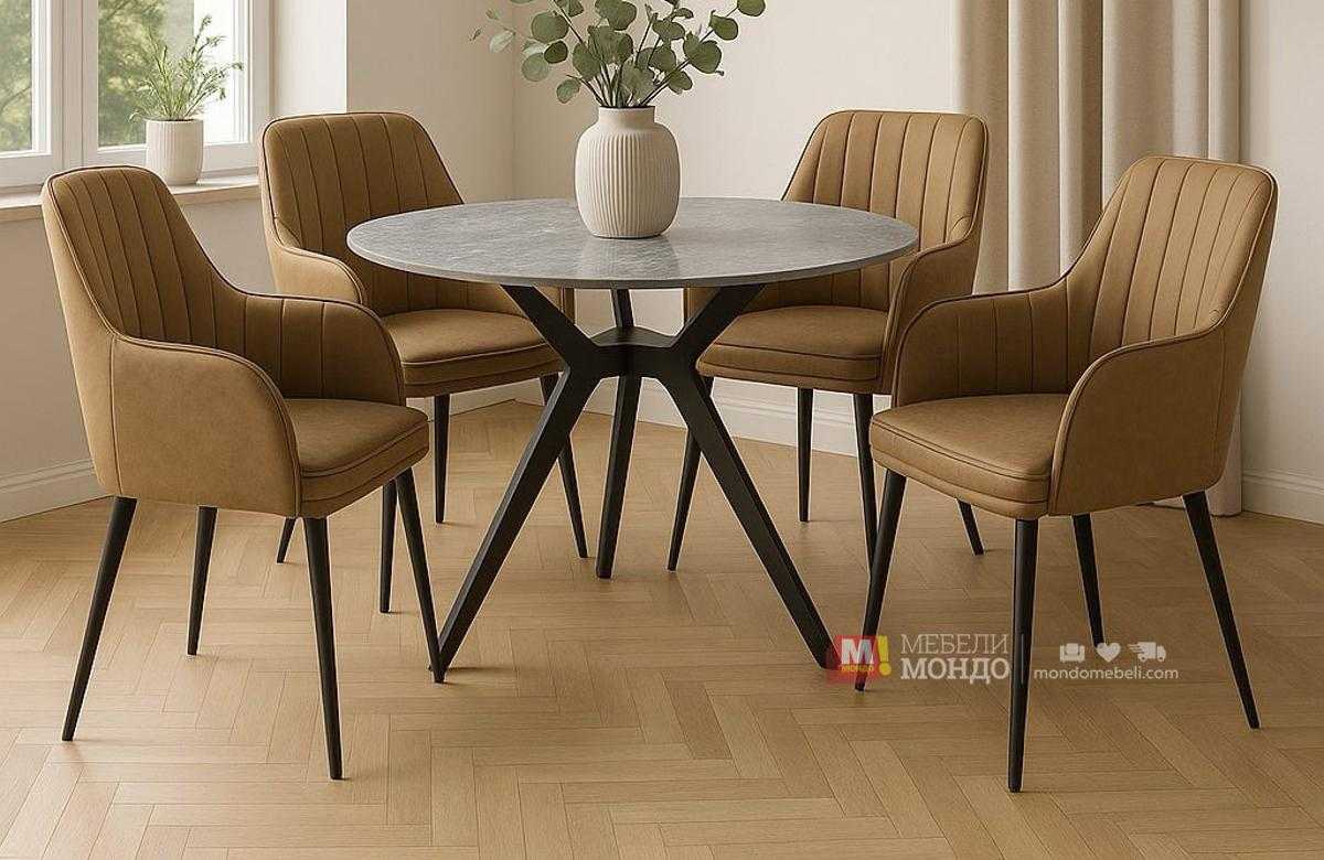 Трапезният комплект Малвин е съчетание на модерен дизайн, здравина и удобство, което го прави идеален избор за всяка трапезария или кухня. Комплектът включва разтегателна маса от синтерован камък и четири удобни стола с дамаска, които създават елегантна и уютна атмосфера у дома.