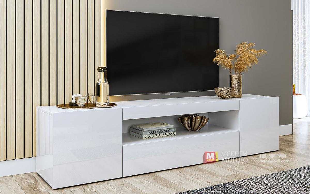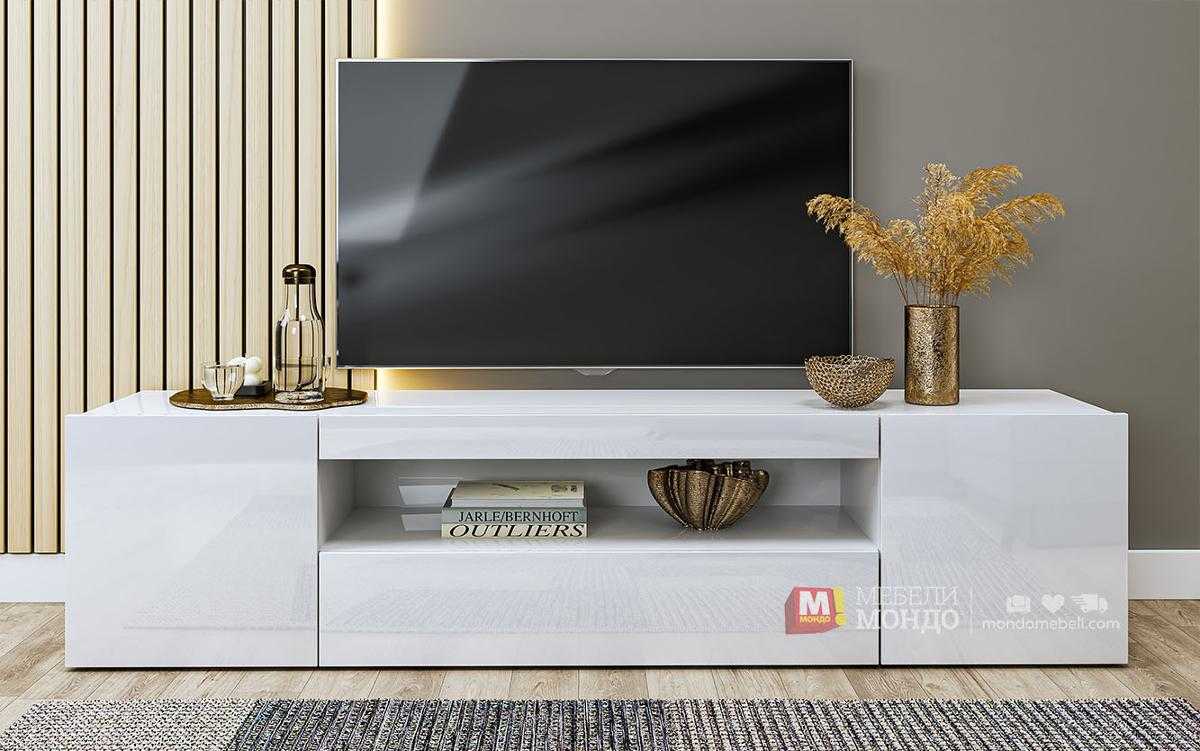 Централният елемент в интериора е наситеният бял гланц. ТВ шкафът и ниската холна маса не просто заемат място – те „отварят“ стаята. Техните огледални повърхности улавят слънчевите лъчи през деня и мекото сияние на нощните лампи вечер, създавайки усещане за необятност и хигиеничен, модерен лукс.