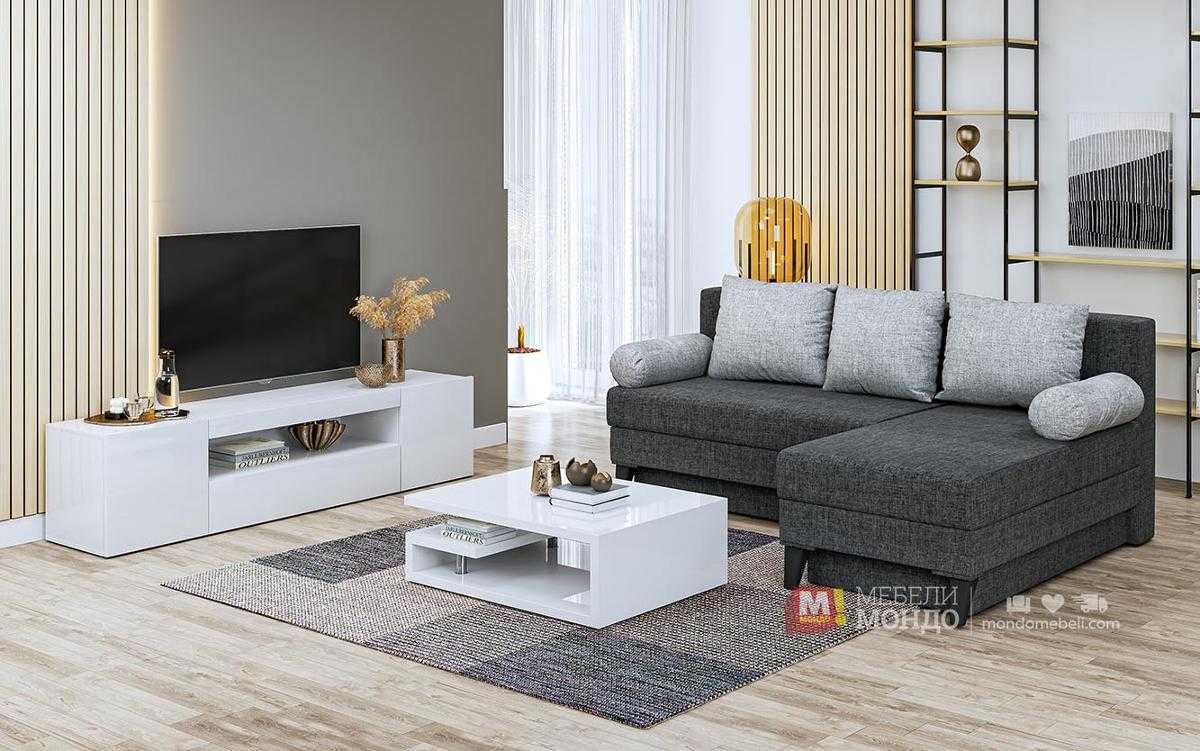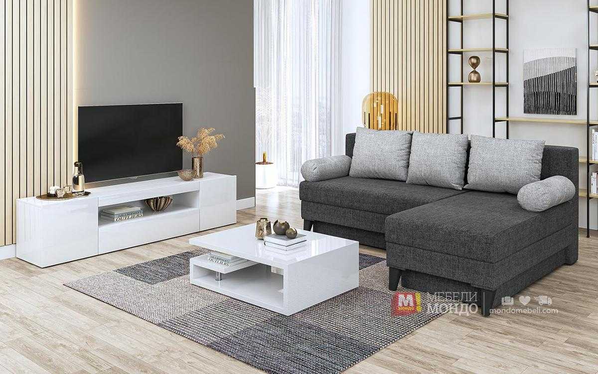 Комплект мебели за дневна стая Микаела включва - ъглов диван с функция за сън и ракла за съхранение, ТВ шкаф и холна маса от МДФ.