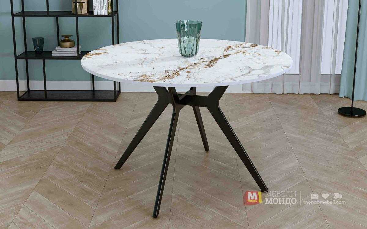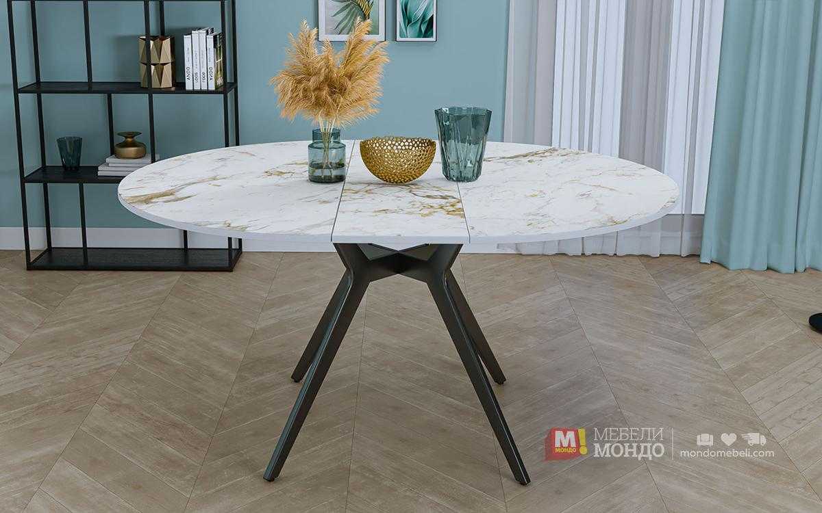 • Разтегателна трапезна маса (модел ДТ 571‑2) с размери 120×120см, разтягаща се до 150 см. Повърхността е от синтерован камък с дизайн бял мрамор, а краката — здрав метал!