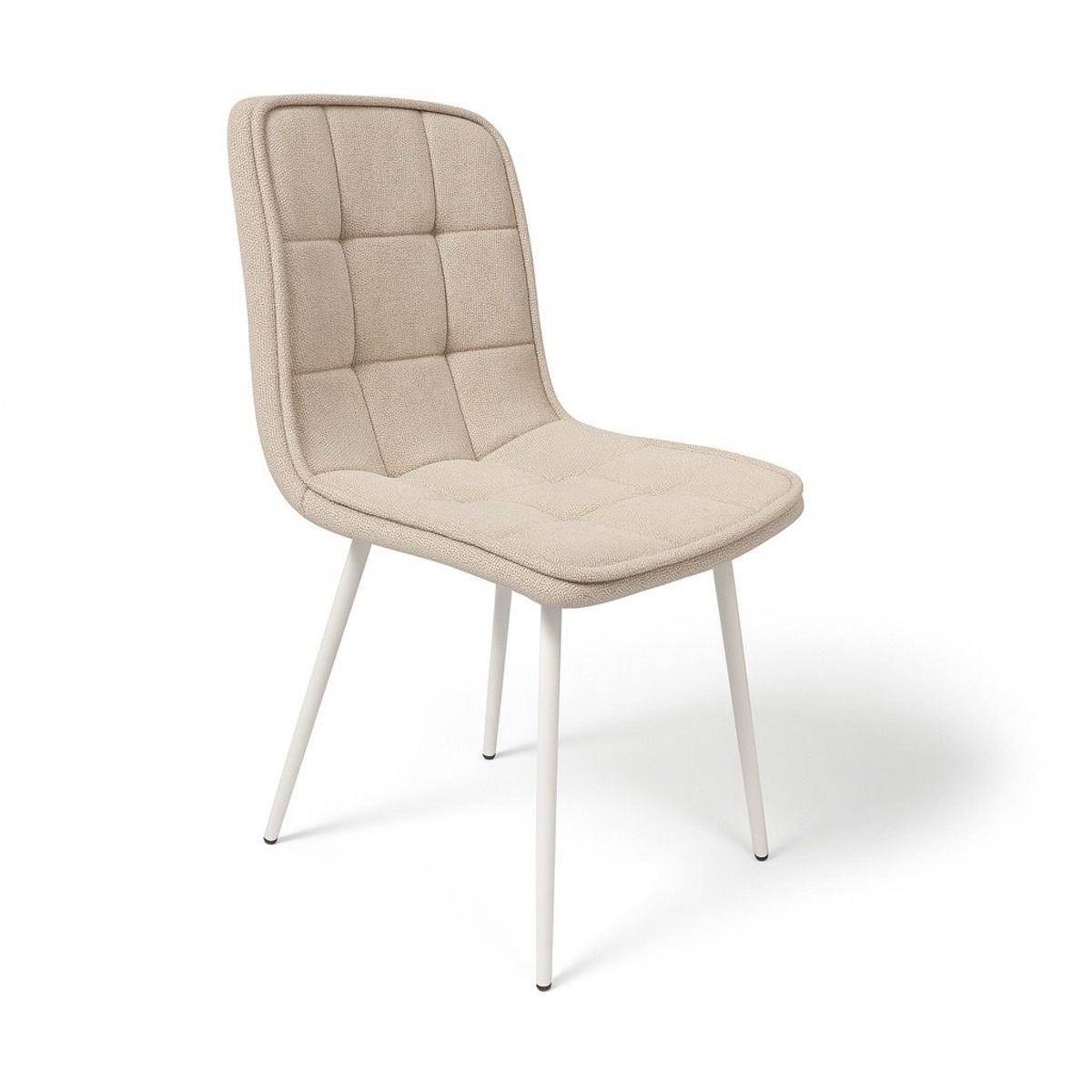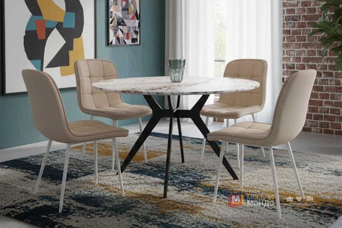 Комплектът включва 4 ергономични тапицирани стола в нежен бежов цвят (капучино), чийто декоративен шев добавя визуален обем и комфорт. Комбинацията от светъл текстил и ефектен мраморен завършек прави този сет идеален за интериори в стил „модерен минимализъм“ или „скандинавски дизайн“.