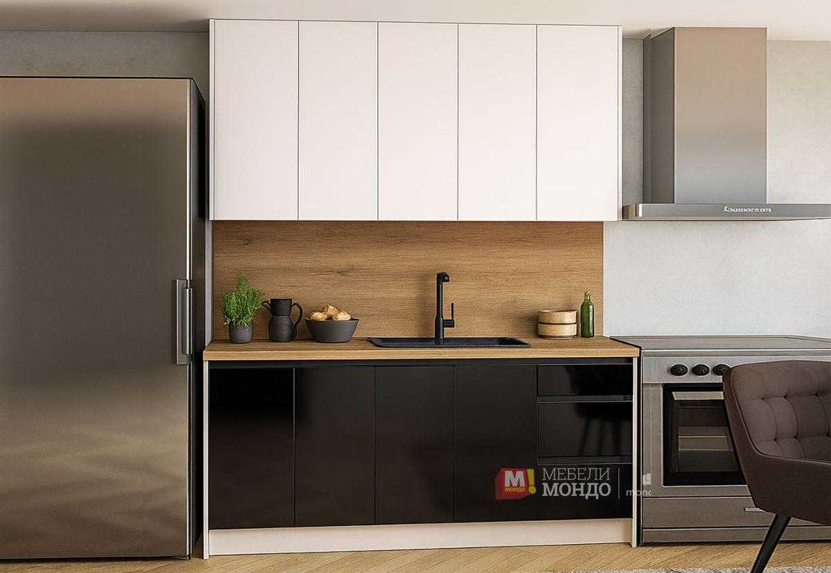 Корпусът е изработен от 16 мм ПДЧ в бял цвят, който носи усещане за чистота и простор. Фронтовете от 16 мм ПДЧ в комбинация бяло и черно придават на кухнята модерен, контрастен и стилен характер, създавайки хармония между светлото и тъмното.