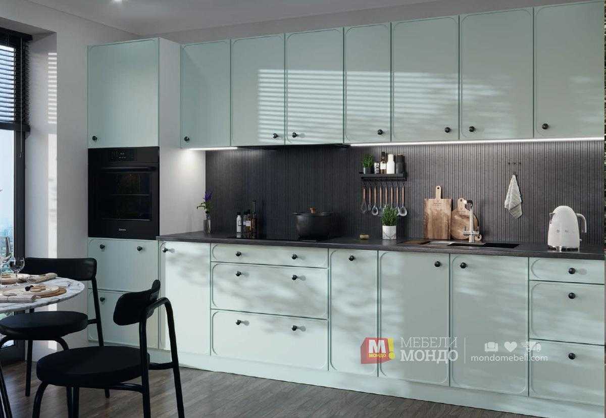 Контрастни черни акценти: Дръжките тип „бутон“ създават драматичен и модерен контраст, който подчертава ментовия цвят.