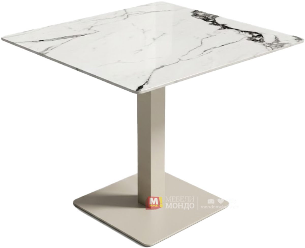 Маса Диа (мрамор) комбинира красотата на мраморния ефект на синтерования камък с издръжливостта на метална конструкция. Плотът носи естествени шарки и усещане за лукс, а стабилната метална основа гарантира дълготрайна употреба. Перфектен избор за трапезария, кухня, офис или заведение — масата добавя елегантен акцент и стил към всяко пространство.