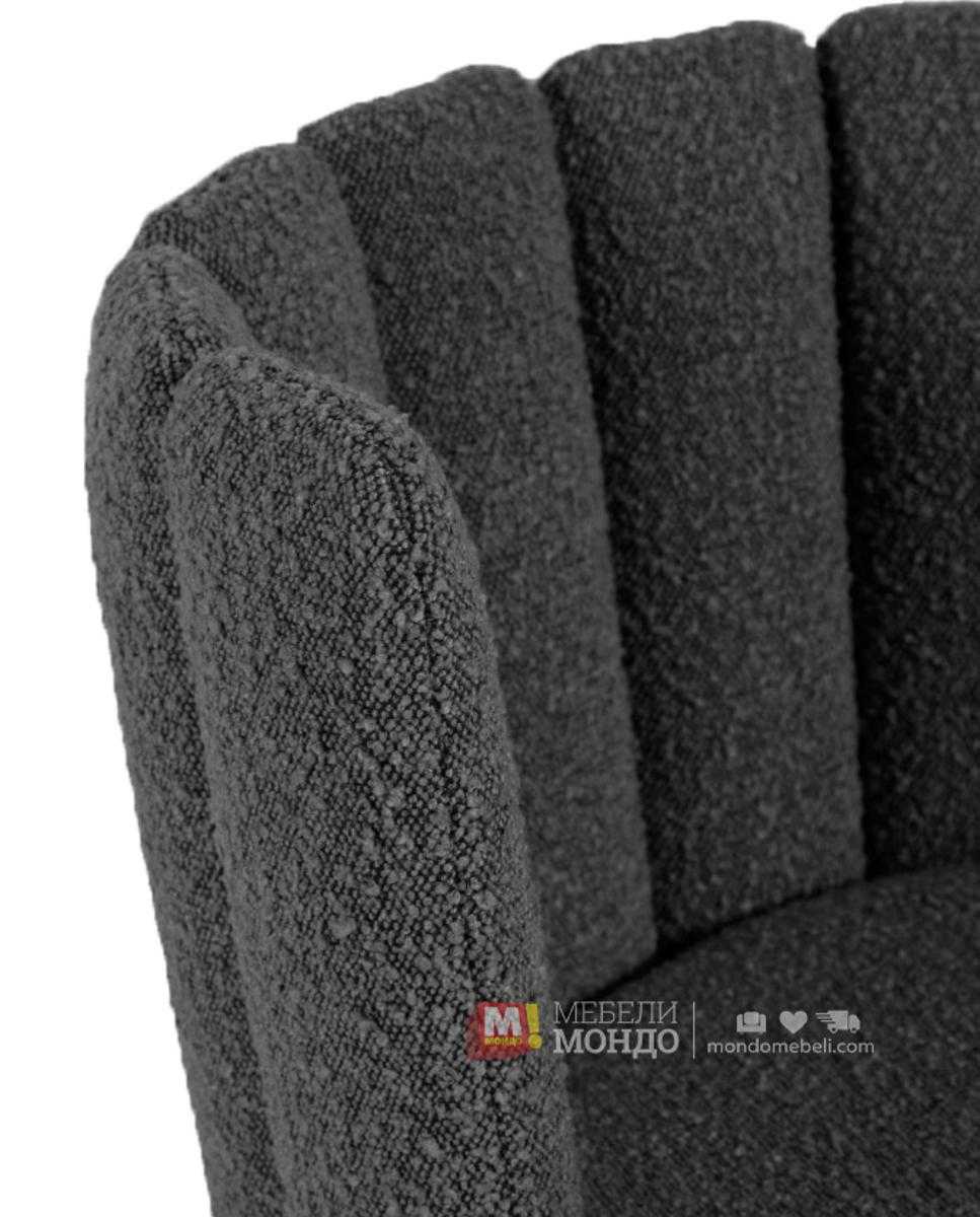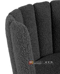 Това, което отличава модела, е букле дамаската в топъл кафяв нюанс – модерна и все по-предпочитана материя за интериор с характер. Тя е нежна на допир, лека и пухкава, с естествена визия, която носи усещане за спокойствие и комфорт. Плетената ѝ структура придава на стола обем и визуална мекота, правейки го идеален избор за интериори в стил бохо, скандинавски минимализъм или градски уют.