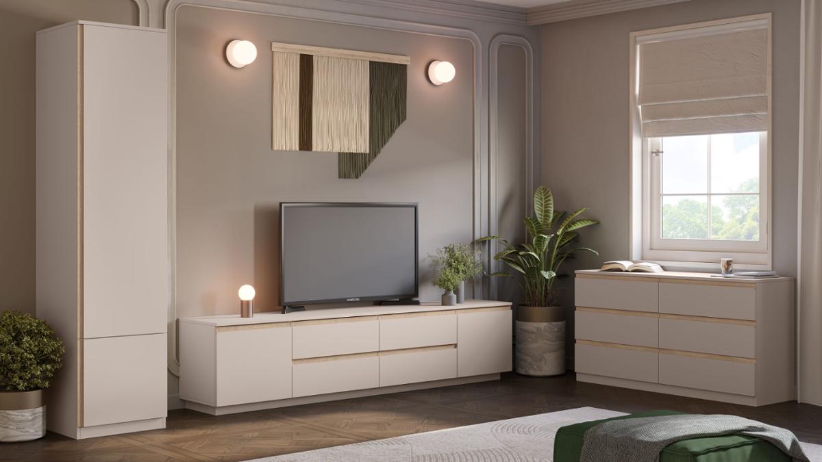 Смарт композиция – Фрида комбинира шкафове, рафтове и пространство за ТВ, осигурявайки достатъчно място за книги, техника и декоративни елементи.