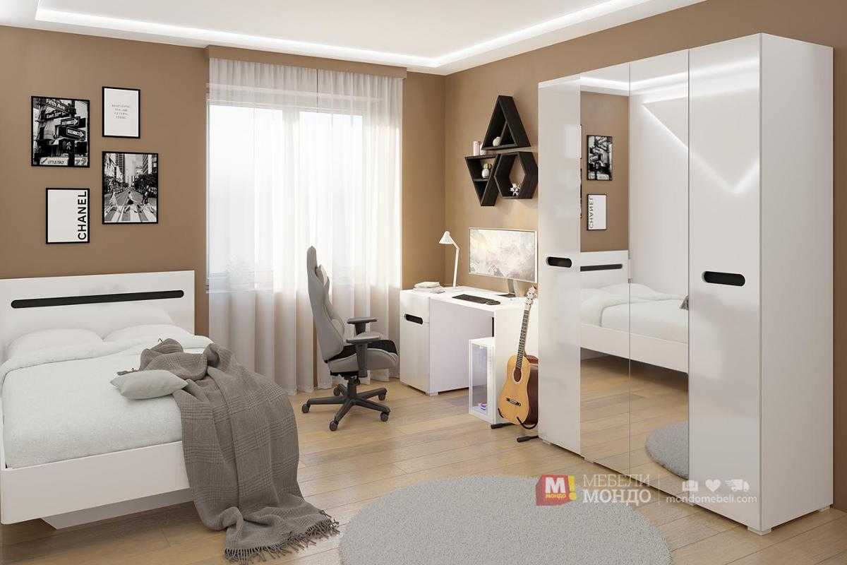 Юношеска стая Бианко Ню в бял гланц с черни акценти. Комплектът включва удобно легло, функционално бюро и 4-крилен гардероб с огледална част за визуално повече пространство. Чистият дизайн и множеството места за съхранение осигуряват подредена и модерна среда за учене, хоби и почивка. Подходяща за тийн стаи и младежки интериори.