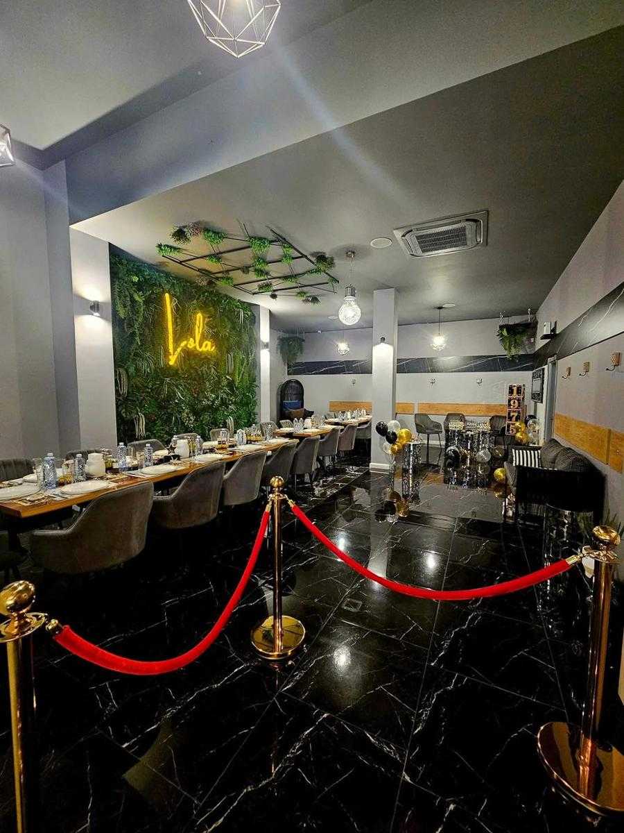 Интериорът на ресторант LOLA е реализиран с обзавеждане от Мебели Мондо, съчетавайки модерна елегантност, комфорт и професионално качество. Пространството е проектирано така, че да създава луксозна, но същевременно уютна атмосфера – перфектен баланс между дизайнерски мебели за заведения, естествени материали и силно визуално присъствие.