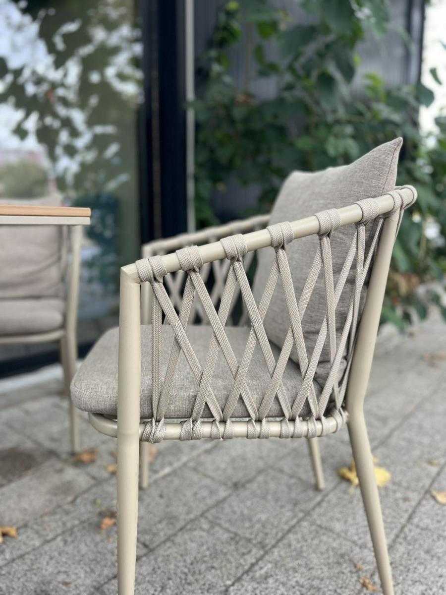 Основният акцент в екстериора са дизайнерските външни столове с плетена конструкция, изработени от водоустойчива и UV-устойчива материя. Техният модерен въжен дизайн придава характер и създава усещане за уют, типично за висок клас обзавеждане за заведения. Меките възглавници осигуряват комфорт дори при продължително седене, което ги прави идеални за кафе, ресторант, пицария или бар.