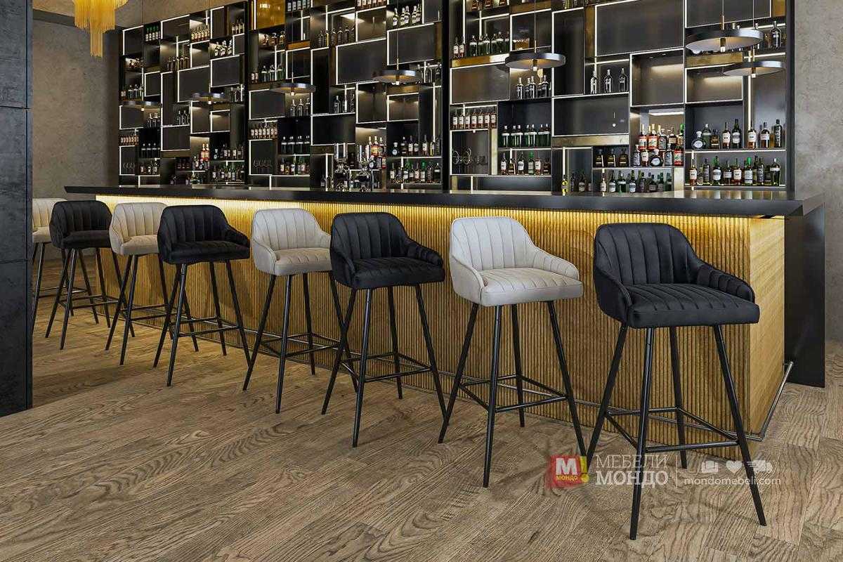 Основен акцент в този проект са луксозните бар столове, разположени пред дизайнерски бар с LED подсветка, която придава блясък и динамика на всяко помещение. Високите бар столове са тапицирани и с подсилени метални крака, осигуряващи стабилност и дълготрайност, дори при интензивна употреба в натоварени заведения.