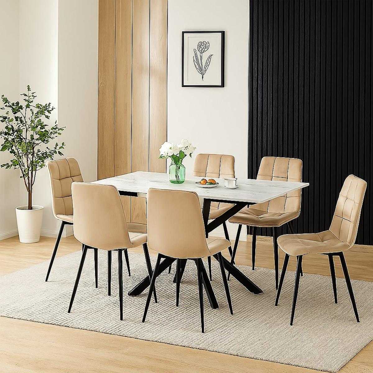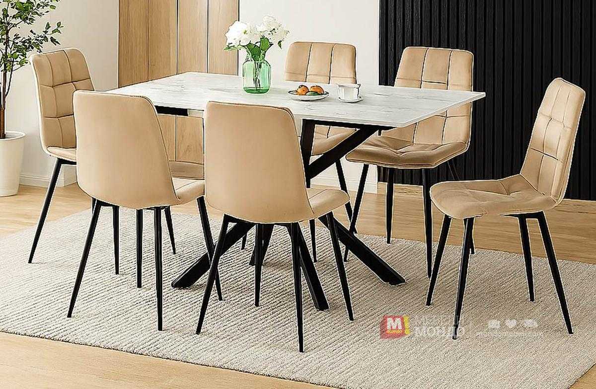 Около масата грациозно се подреждат шест трапезни стола с меко бежово покритие, които придават топлина и уют на пространството. Тяхната тапицирана седалка, обогатена с деликатен капитонаж и внимателно скосена облегалка, кани тялото да се отпусне в комфорт, а съзнанието – в спокойна вечеря с любими хора. Високите метални крака, изцяло в черно, придават модерен акцент и съвършено балансират нежния текстил.