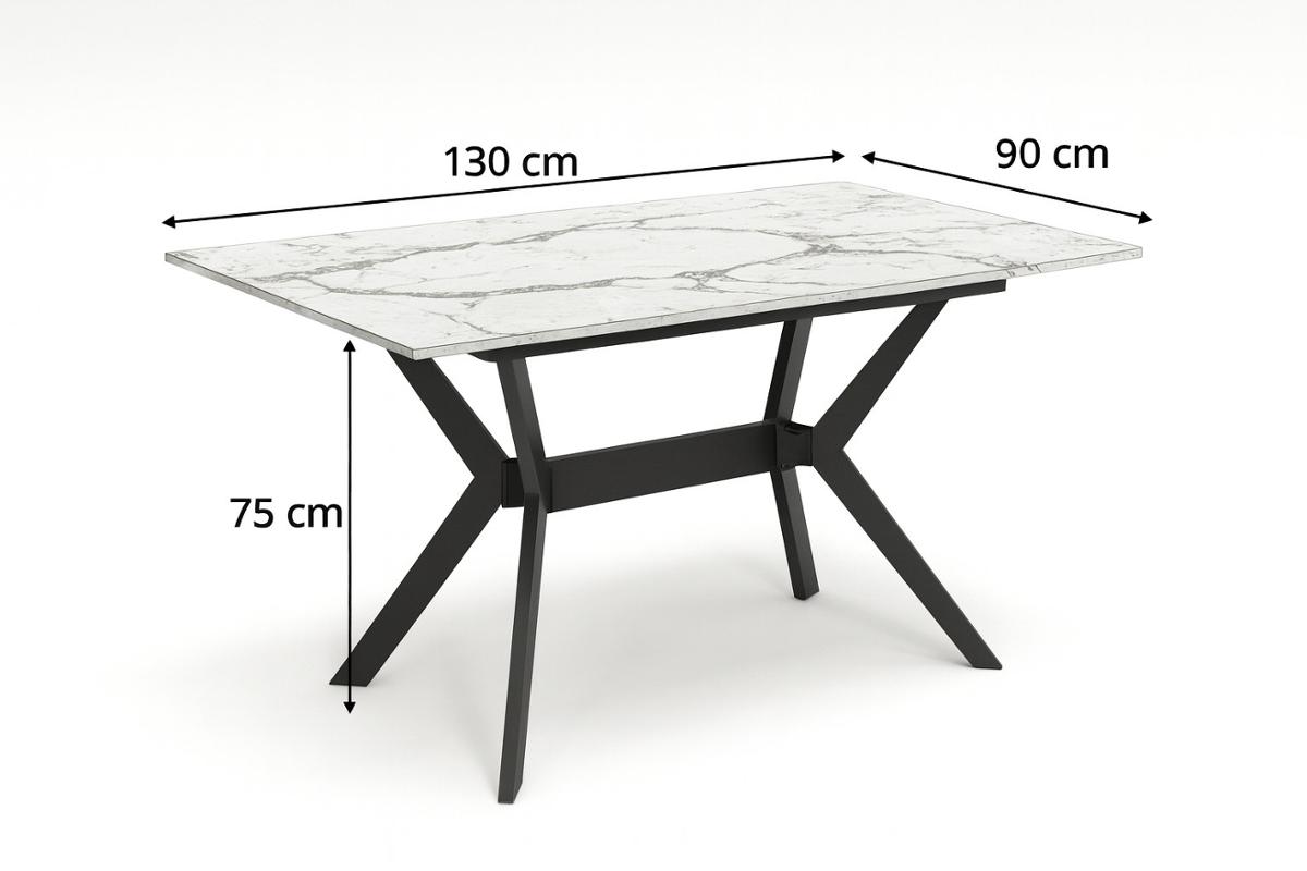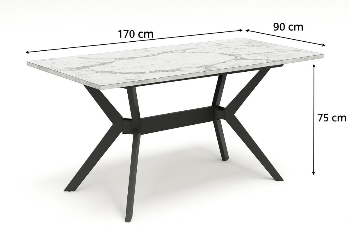 Впуснете се в свят на съвършена хармония между функционалност и естетика с този изискан трапезен комплект в скандинавски стил. В сърцето на композицията е разположена маса с мраморен плот, чиято повърхност блести с фина игра на светлина и нежни сиви жилки, напомнящи за спокойствието на северните пейзажи. Правите ѝ линии и елегантната геометрия на черните метални крака, кръстосани под артистичен ъгъл, създават усещане за лекота и стабилност едновременно.