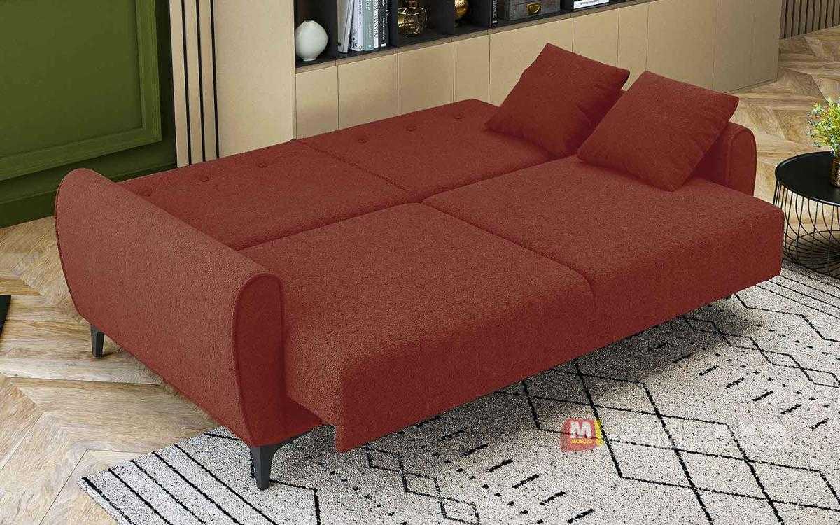 Диванът е оборудван с механизъм "клик-клак", който позволява лесно и бързо превръщане от диван в легло с размери 100 см по 182 см, идеално за нощувка на гости. Включената опция за ракла добавя практично пространство за съхранение, идеално за домакинства, които ценят реда и организацията.
