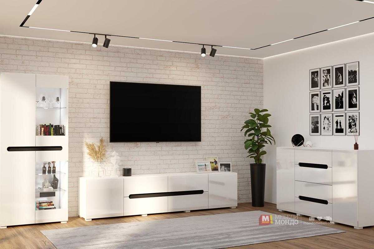 Модулна секция Бианко Ню 2 в бял гланц с черни акценти е модерно и стилно решение за дневна или хол. Изчистеният дизайн съчетава функционалност и елегантност – включва ТВ модул, витрина със стъклени рафтове и шкафове за съхранение, както и комод с чекмеджета. Черните декоративни елементи придават характер и контраст, който се вписва идеално в съвременни интериори. Секцията предлага достатъчно място за техника, книги, декорации и лични вещи, като едновременно поддържа ред и стил в дома.