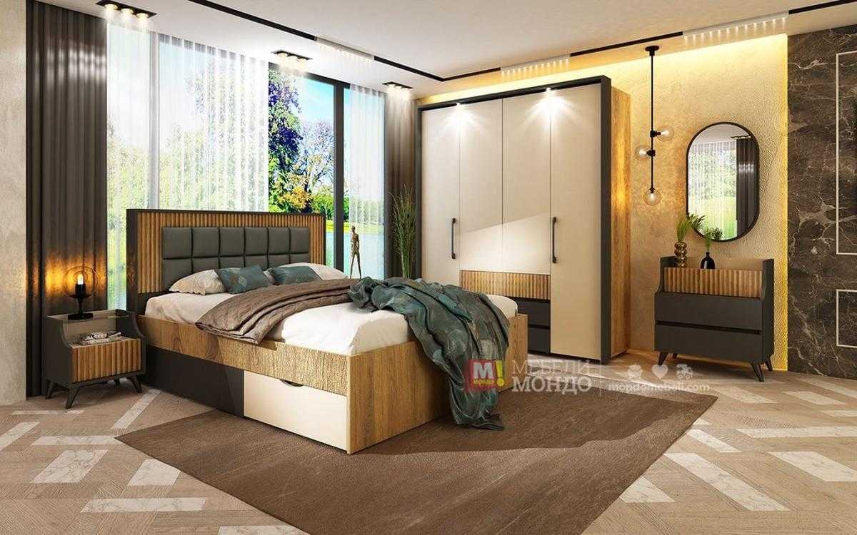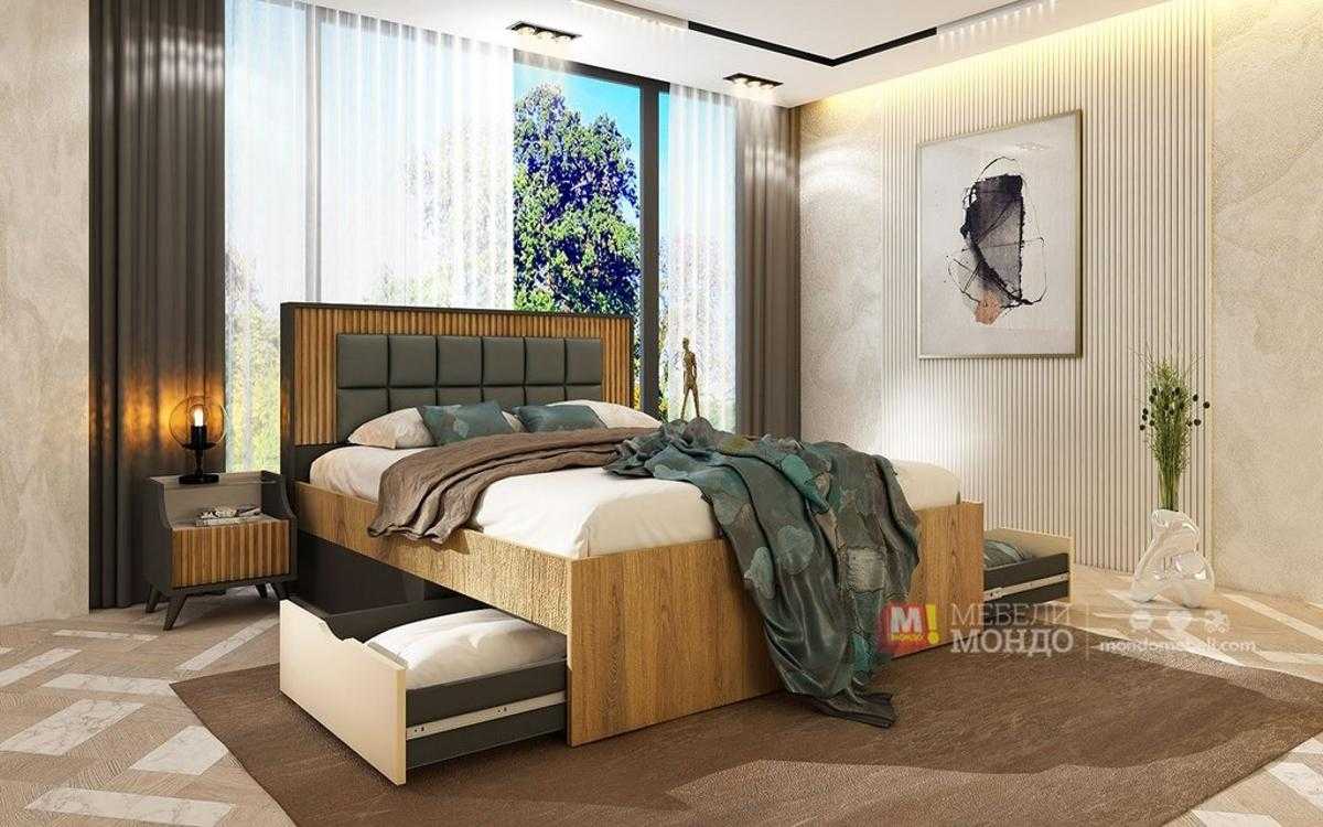 Спалня Кинг включва легло за матрак 160/200 с чекмеджета, 2 броя нощни шкафчета и гардероб. Отделно може да закупите скрин с огледало на цена 342 лв.