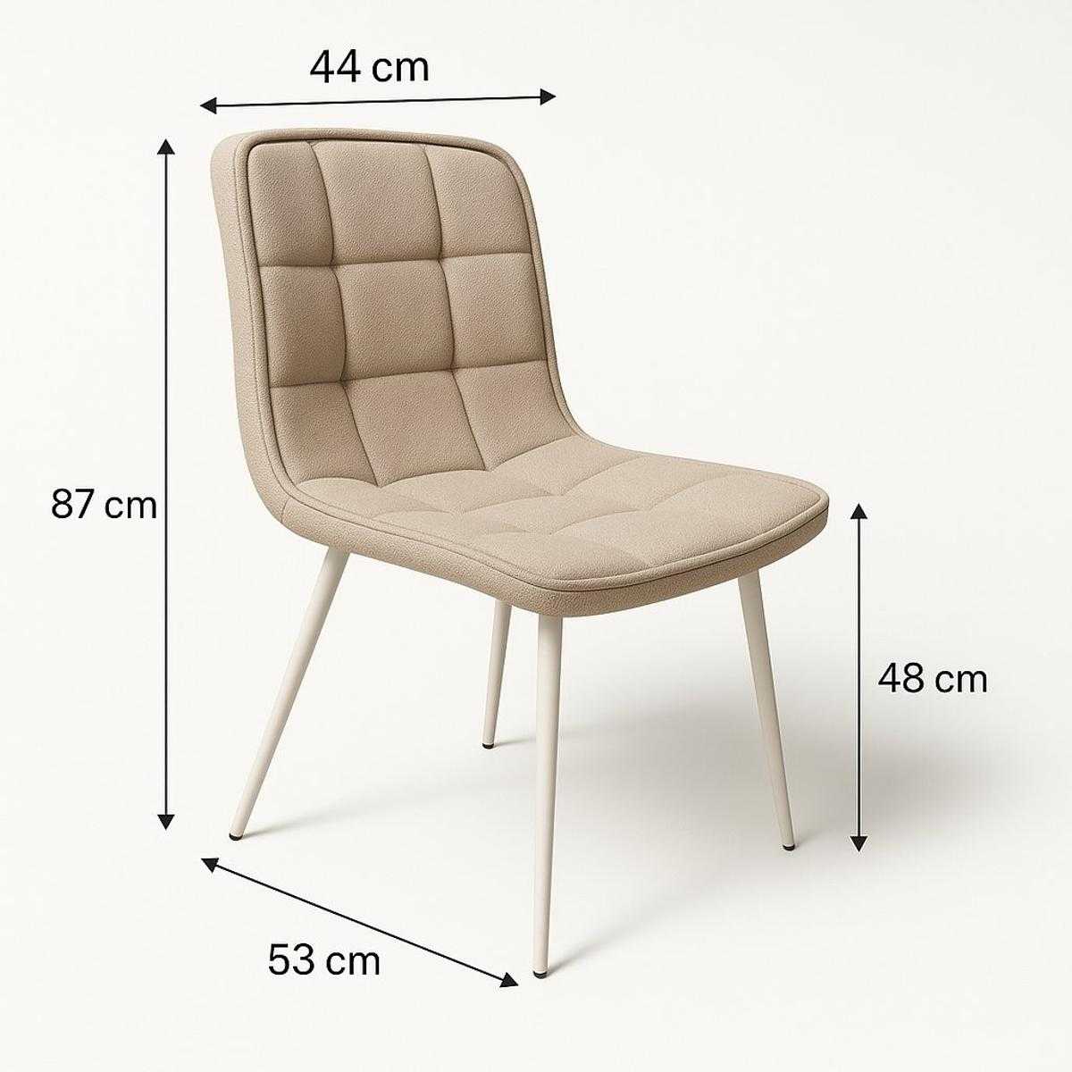 „Стол Нола – модерен трапезен стол с широчина 44 см, височина 87 см, дълбочина 53 см и височина на сядане 48 см. Облечен в бежова дамаска с метални крака. Отличен избор за всекидневна, кухня или заведение. Купи на топ цена от Мебели Мондо.