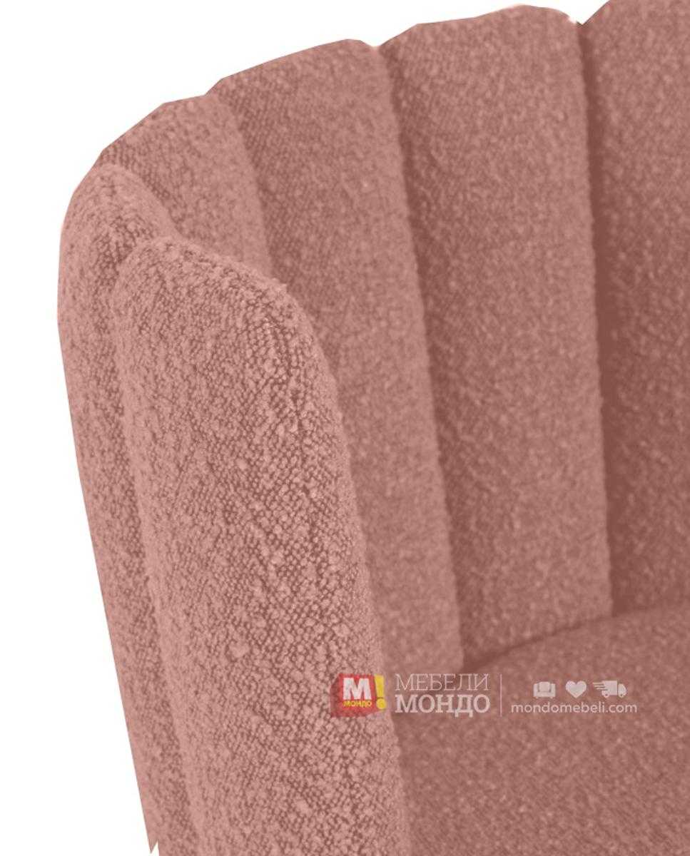 Истинската магия обаче идва от букле дамаската в пастелно розов цвят – усещане за нежност, женственост и стил. Тази текстура съчетава топлота и модерен лукс, докосвайки сетивата и визуално, и при допир. Цветът е ненатрапчив, но изключително ефектен, създава усещане за лекота и светлина в пространството.