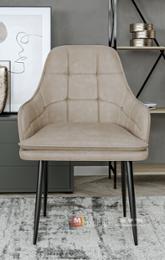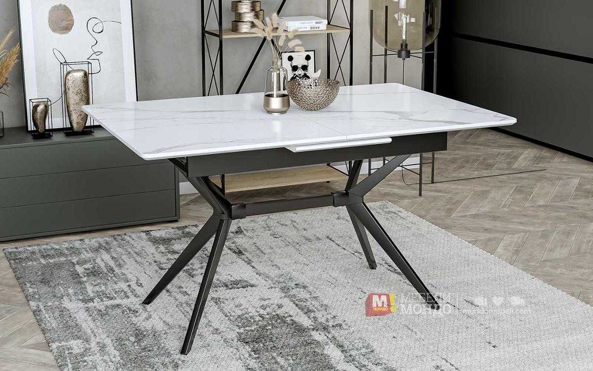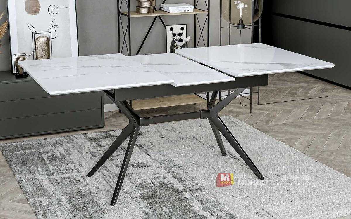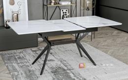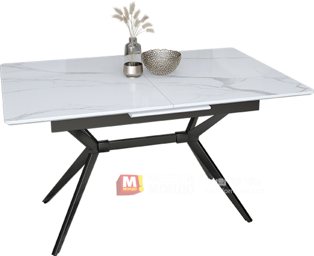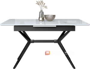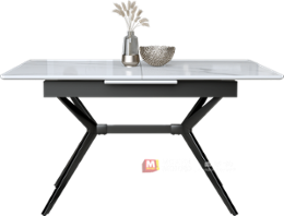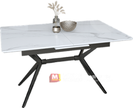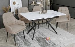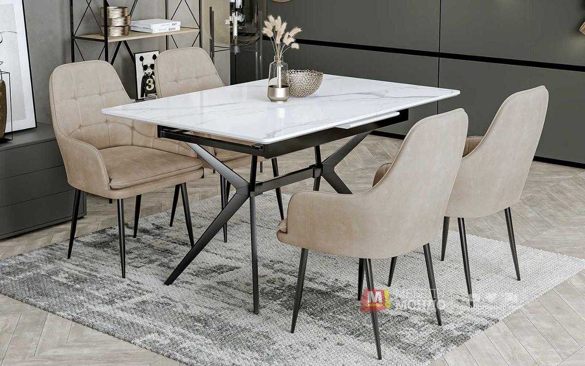 Този трапезен комплект включва разтегателна маса със синтерован камък с плот в бял мрамор и 6 бежови столa с метални крака и дамаска — удобни и стилни. Масата е с размер 90×140 см (180 см. разтегната), столовете са с комфортна височина и седалка. Комплектът съчетава модерна визия и практичност, подходящ за всекидневна и трапезария.