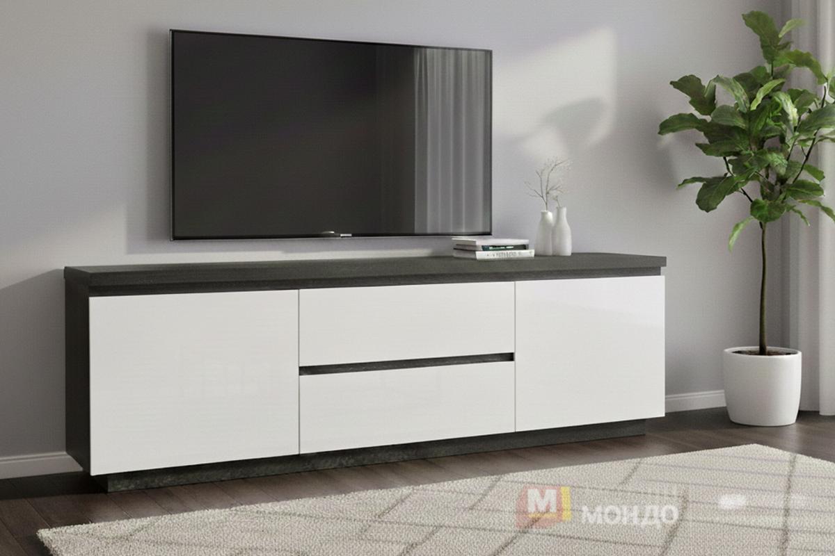 Максимална функционалност: Снабден с две просторни отделения с врати и удобни чекмеджета в централната част, шкафът предлага достатъчно място за съхранение на мултимедийни устройства, аксесоари и документи.